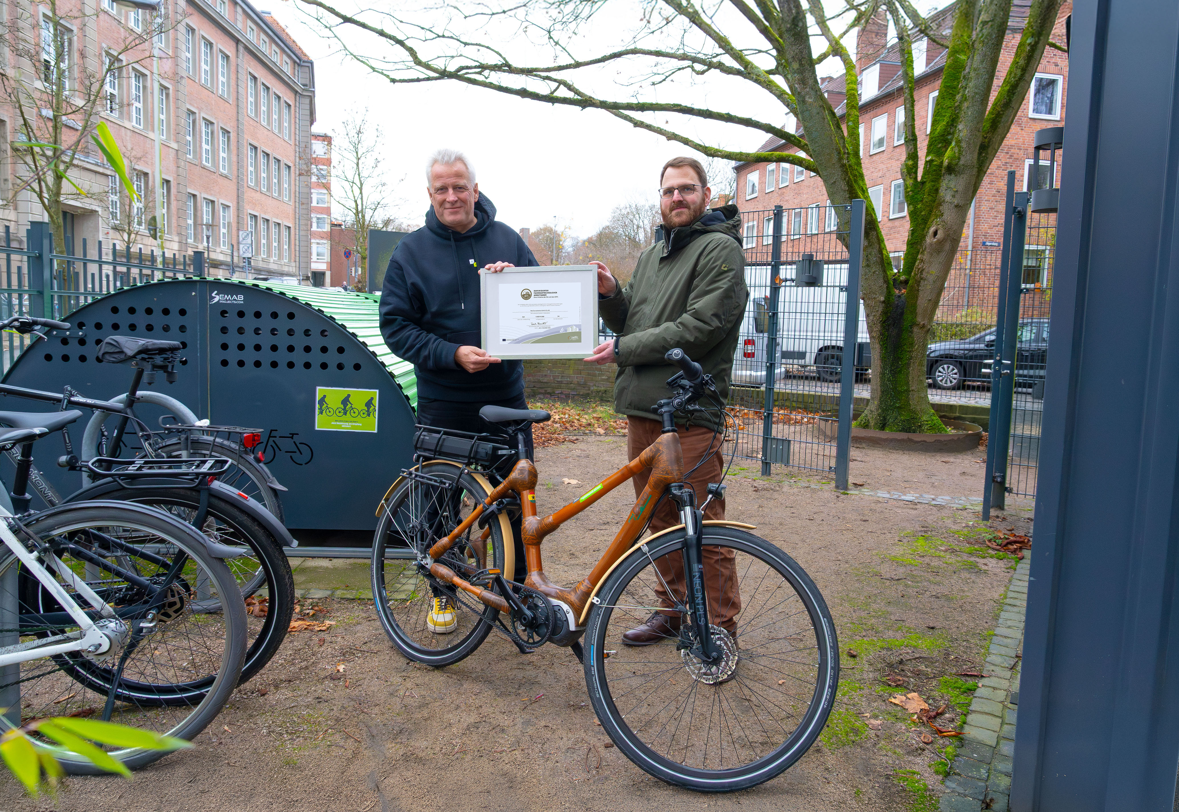 Jan Voß (ADFC SH) übergibt das Zertifikat "Fahrradfreundlicher Arbeitgeber" in Gold an Sören Mohr (Geschäftsführer New Communication)