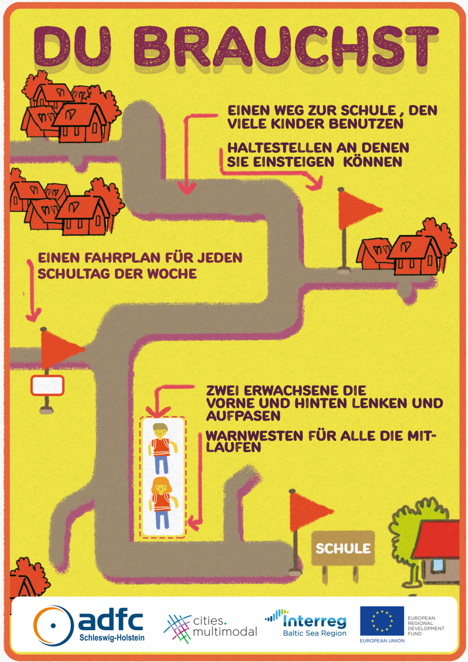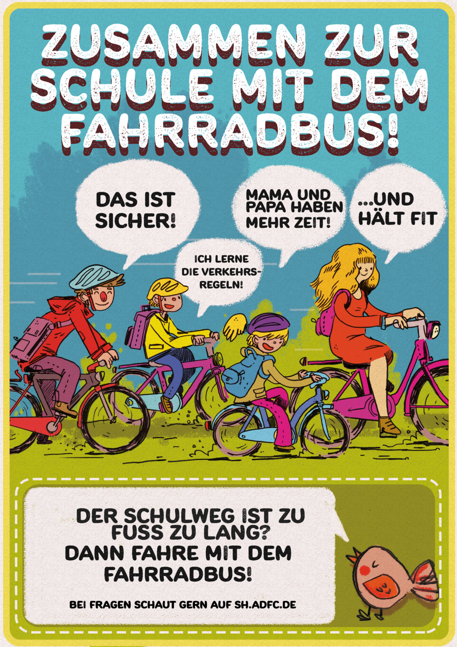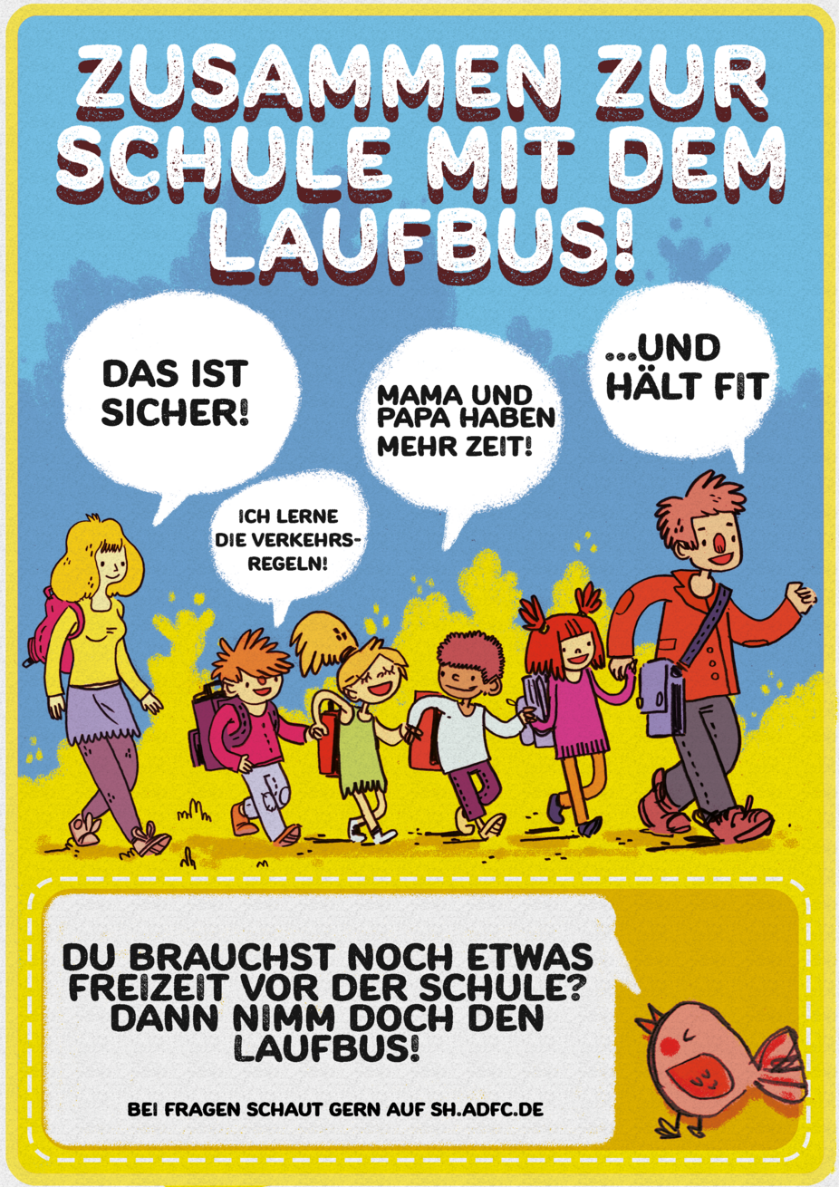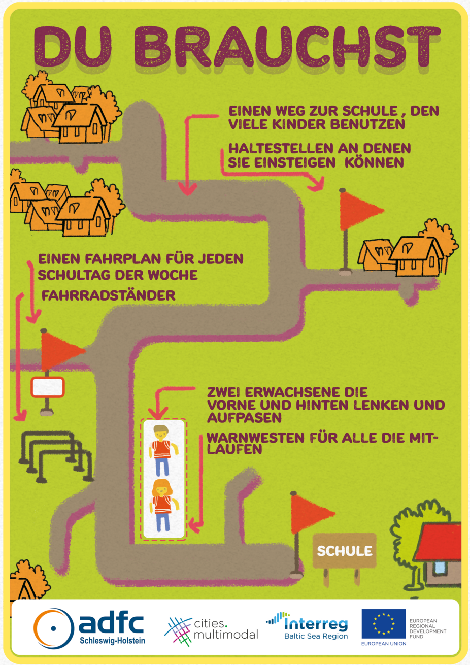 Da gemeinsam alles vieles besser, stellt der ADFC dabei auch die Mobilitätsformate "Laufbus" und "Fahrradbus" vor. Ziel: Gemeinsam in (Klein-)Gruppen zu Fuß oder mit dem Fahrrad Wege zurücklegen. Was man für solche Gruppen braucht, wird auf den beiden Karten kindgerecht erklärt.